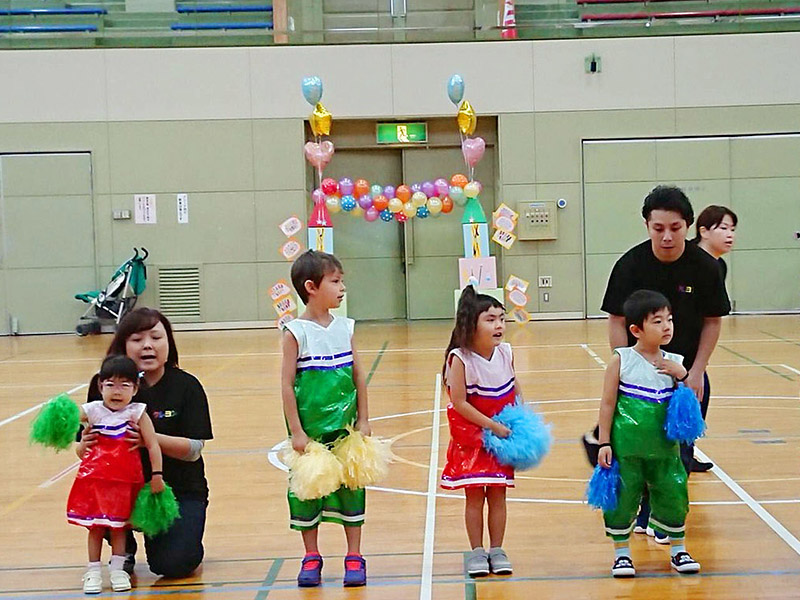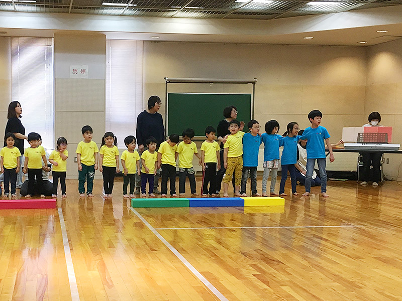 OT(作業療法士)の先生と一緒に音楽のリズムに合わせて、子ども達に親しみのある動物に模して走ったり、止まったり、跳んだり、転んだり、這ったり、舞ったり、体で表現しながら子どものからだの骨や筋肉、関節、神経系の発達を促して育てていきます。